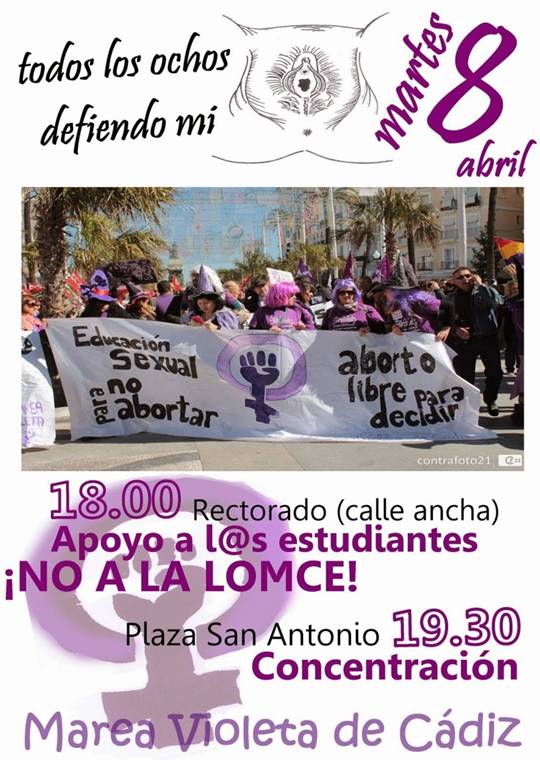 Marea Violeta está aquí, otro día 8 más, para seguir reivindicando nuestro derecho a decidir. Ya salimos a la calle el día 8 de febrero, el día 8 de marzo, y volvemos a las calles el 8 de abril. Y esta vez, unimos nuestras reivindicaciones con las del movimiento estudiantil y sus justas reclamaciones: que no haya obstáculos económicos para estudiar una carrera… Quien quiera estudiar, debe poseer las herramientas y posibilidades para ello, venga del entorno socioeconómico que sea. Y, al igual que ellos y ellas, nos mostramos en contra de la nueva ley de educación, la LOMCE, recientemente aprobada por el gobierno del PP.Esta nueva ley (mal llamada de la Mejora de la Calidad Educativa), además de promover la competitividad en las aulas, y disminuir la posibilidad de participación de los padres y madres en los consejos escolares, otorga más valor a la asignatura de Religión. Por primera vez en 20 años, la asignatura de Religión contará para la media final de curso y servirá para pedir ayudas y becas. Esta asignatura podrá cursarse a la vez que su alternativa «Valores Culturales y Sociales o Valores Éticos» y ambas tendrán el mismo peso. No podemos entender que se pueda equipar la asignatura de Religión a la Historia, la Filosofía o a las Matemáticas. Las creencias religiosas se incluyen en la esfera privada de los ciudadanos y por tanto deben desarrollarse en el seno de las familias o los grupos religiosos, y nunca pueden ser asumidas por la escuela pública que además, según dispone el estatuto de Autonomía de Andalucía, debe ser laica.