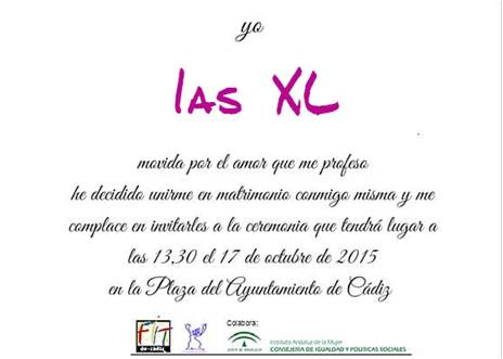 A las 13:30 fuimos testigas de la acción colectiva creada por May Serrano (Bilbao) donde nos casamos con nosotras mismas. El acto consistió en realizar una performance por las calles de Cádiz donde algunas de nosotras iban vestidas de novia y repartíamos naranjas y dípticos a las personas que estaban por la calle. El objetivo de esta acción es mostrar nuestro compromiso de amor con nosotras mismas públicamente y al mismo tiempo abrir un debate sobre el modelo de amor romántico que impera en nuestra sociedad.