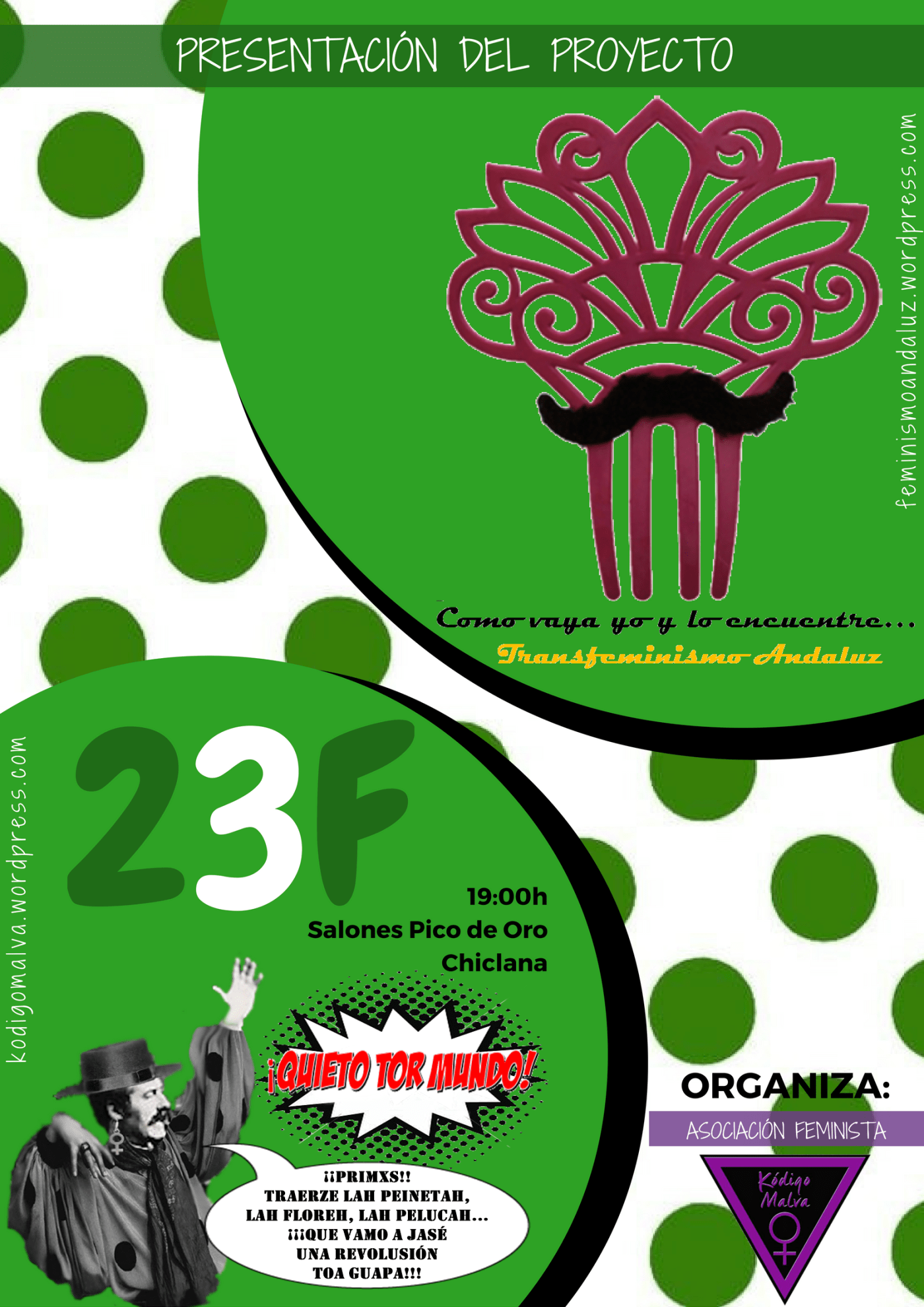El acto será un humilde golpe de estado con peluca y peineta, una amenaza a los valores clasistas de nuestras miradas y un llamamiento a nuestro yo más folclórico y a los pipazos con las amigas que pregonaba Lola Flores. Esperamos, de corazón, vuestra asistencia.