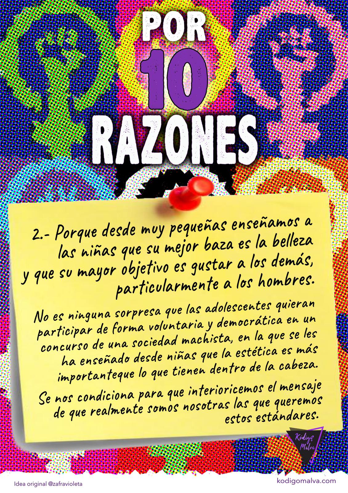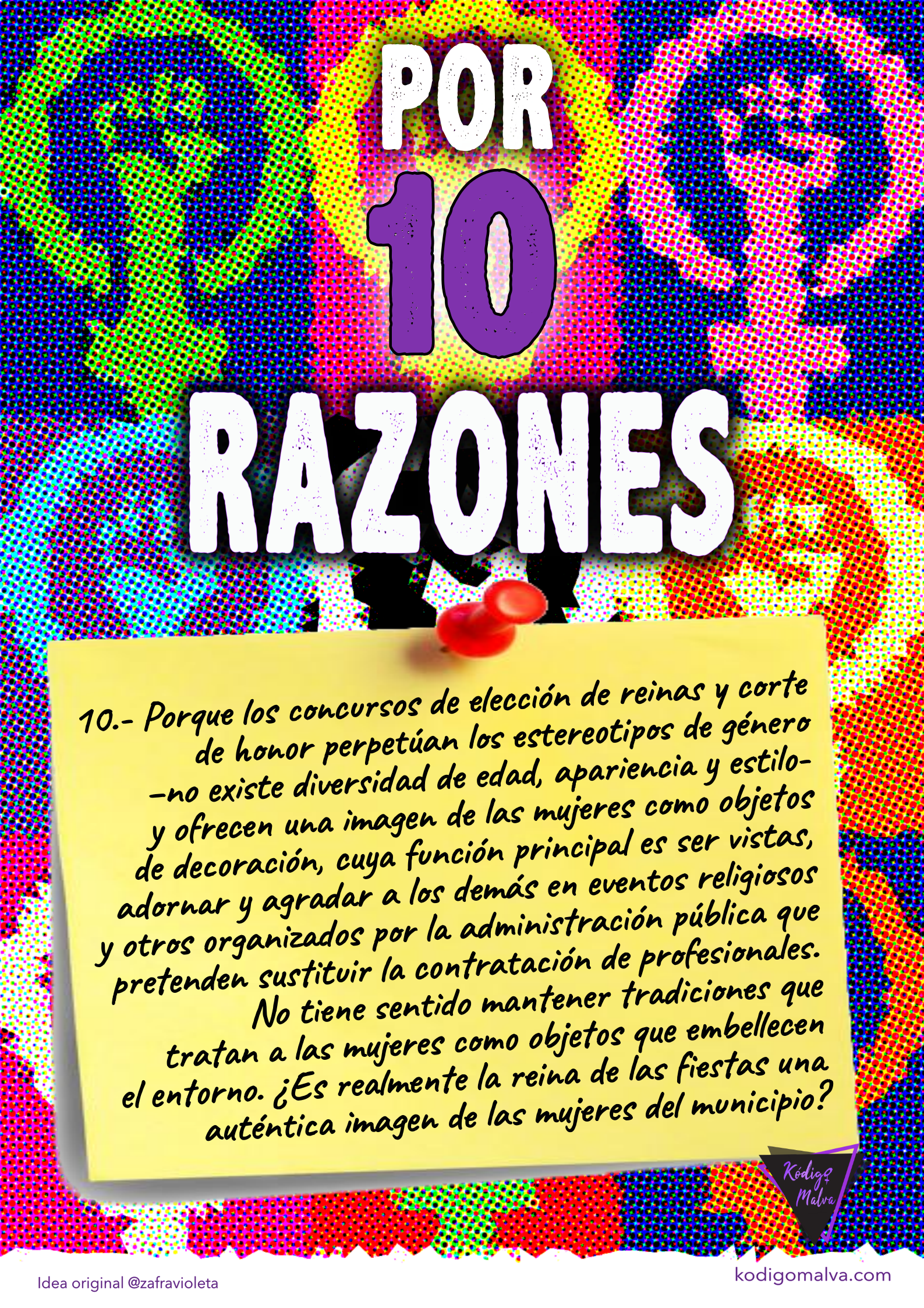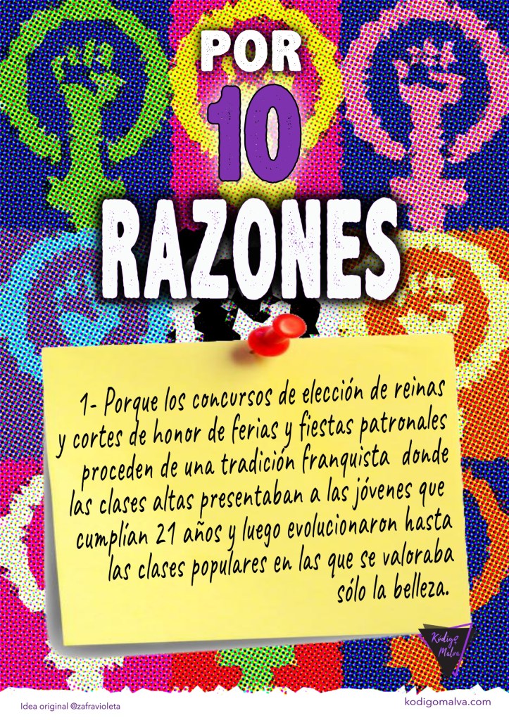Los feminismos no entran a valorar las decisiones personales de las mujeres. Los feminismos tienen el objetivo de poner el foco en los mecanismos y estrategias de este sistema que siguen perpetuando la desigualdad. Porque los concursos de belleza son una muestra en pequeñito, de la sin razón del mundo en el que vivimos (clasista, machista, etnocentrista, mercantilizado, dominado por poderes que generan una cultura superficial y ramplona) todo lo cual nos convoca a seguir luchando por OTRO MUNDO POSIBLE. Desde Kódigo Malva proponemos unas fiestas donde se visibilice la diversidad y cualquier persona/colectivo o grupo pueda representar a nuestra localidad.