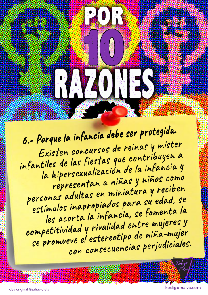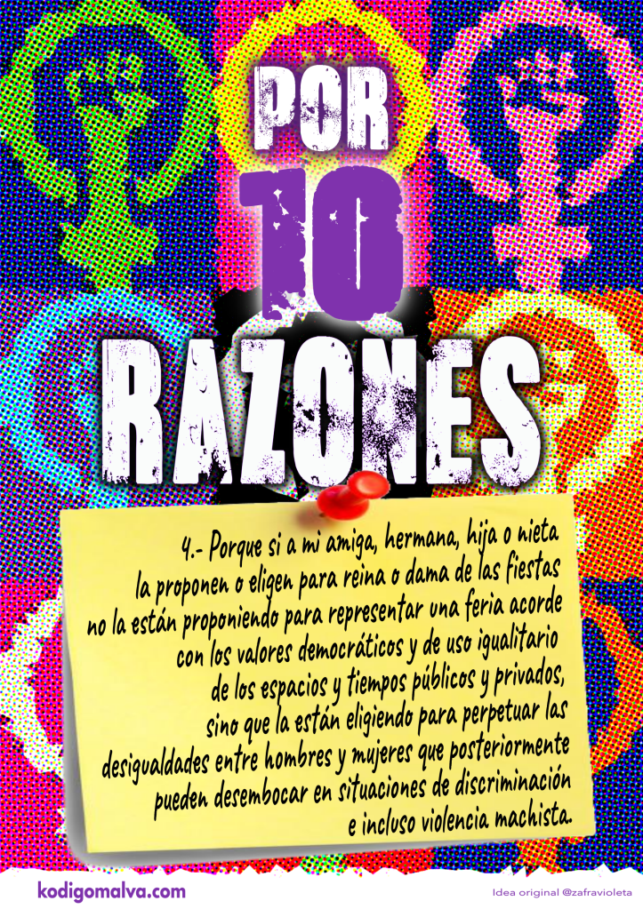 Razón 4: Porque las propuestas o elecciones de mujeres y niñas para reinas o damas de las fiestas no se realizan bajo parámetros democráticos y de uso igualitario de tiempos y uso de los espacios, las eligen para seguir perpetuando las desigualdades entre hombres y mujeres y pueden desembocar en situaciones de discriminación e incluso violencia machista.