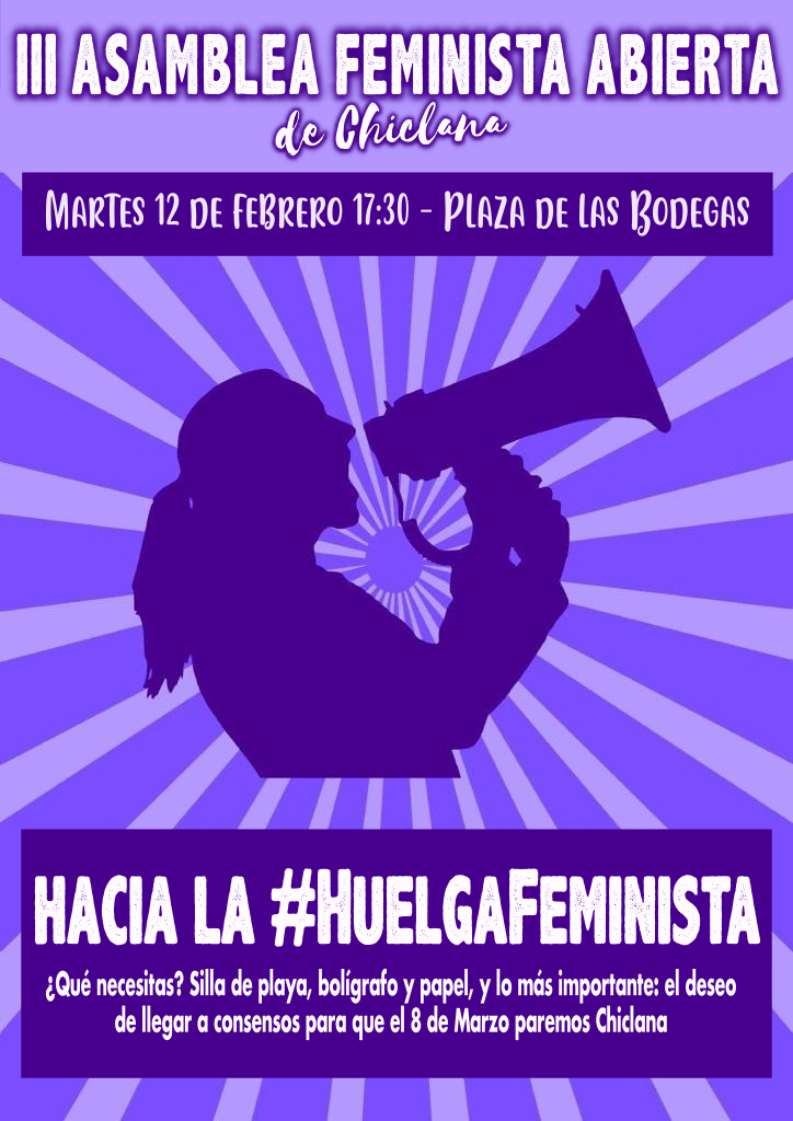 Será la tercera asamblea que el movimiento feminista chiclanero celebre para continuar organizando la huelga feminista convocada a nivel internacional con motivo el 8M, una movilización que estará estructurada en cuatro ejes: huelga laboral, huelga de cuidado, huelga de consumo y huelga estudiantil.