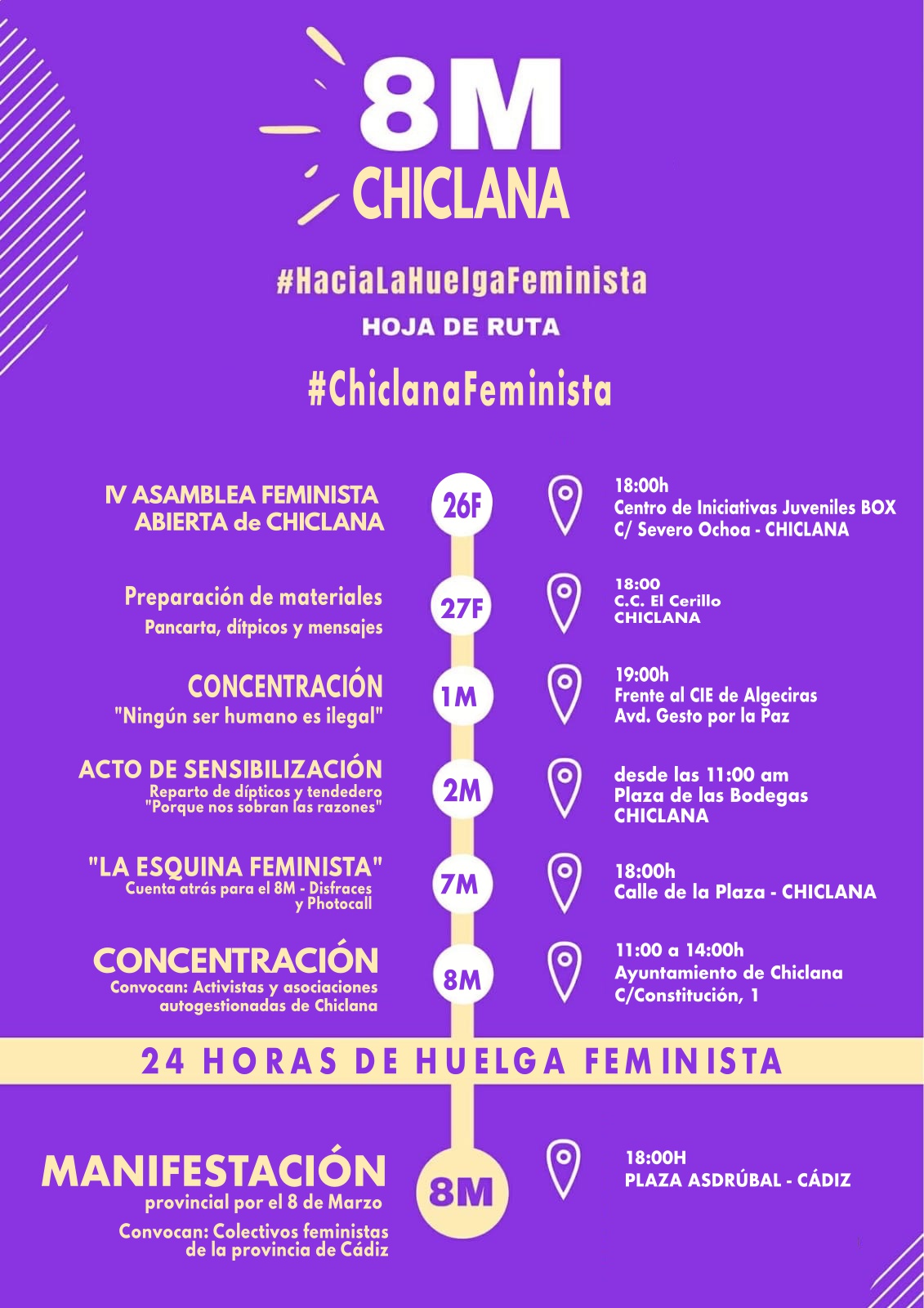 Os dejamos con la hoja de ruta propuesta con las distintas actividades previas a la concentración convocada en la puerta del Ayuntamiento de Chiclana para el día 8 de marzo a las 11:00h y la manifestación que tendrá lugar en Cádiz por la tarde a partir de las 18:00h. ¡Anímate!