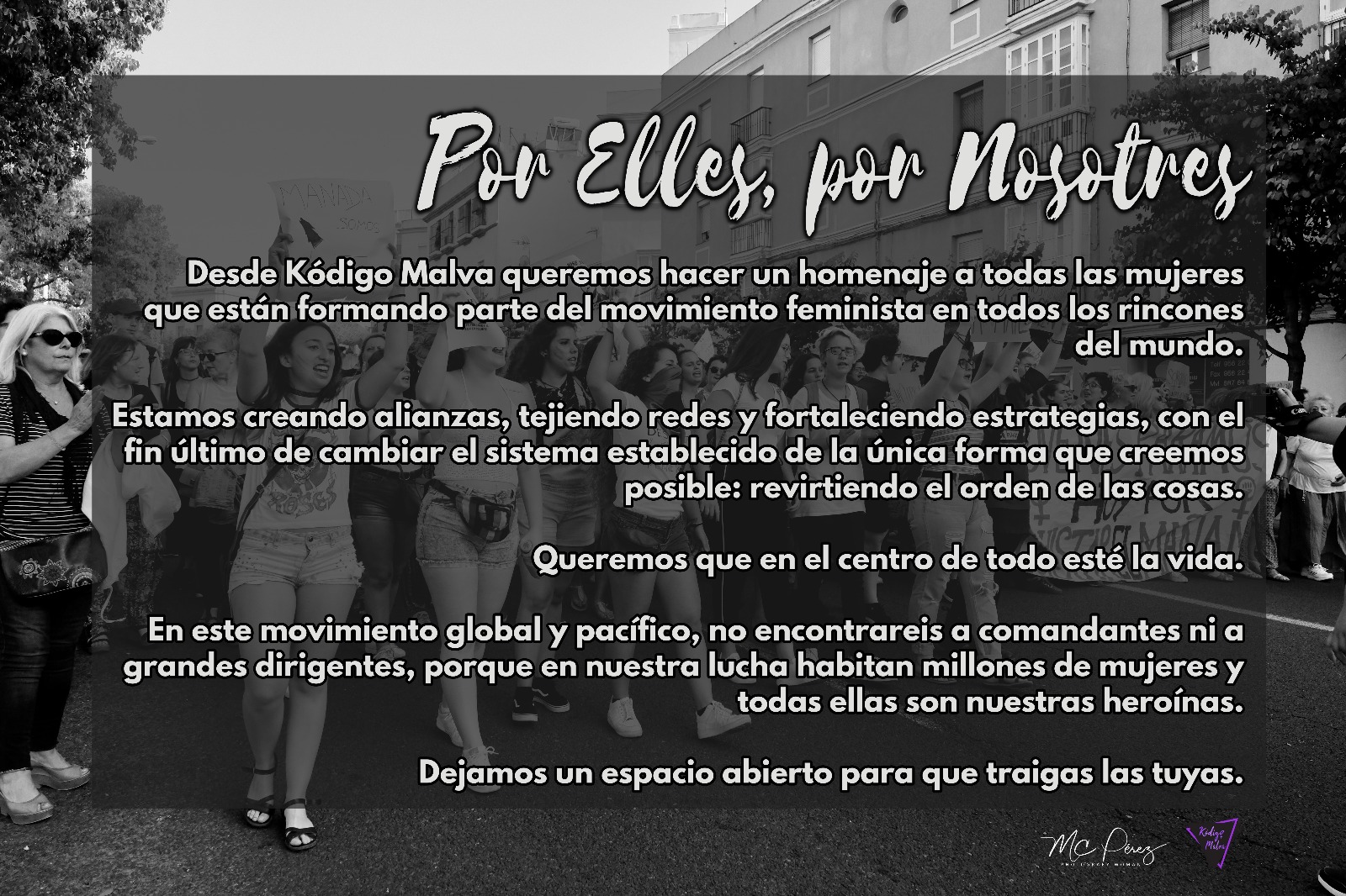 Desde Kódigo Malva queremos hacer un homenaje a todas las mujeres que están formando parte del movimiento feminista en todos los rincones del mundo. Por ello colaboraremos, a través del trabajo fotográfico de nuestra compañera Mª Carmen Pérez con la exposición fotográfica «Por Elles, por Nosotres», en la exposición «En Poder-Arte» de las compañeras de la Asociación de Mujeres Artesanas de Chiclana-ASACH del 5 al 19 de marzo en la Casa de la Cultura (Sala Sebastián Gessa).