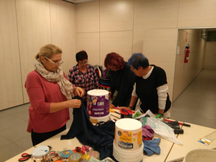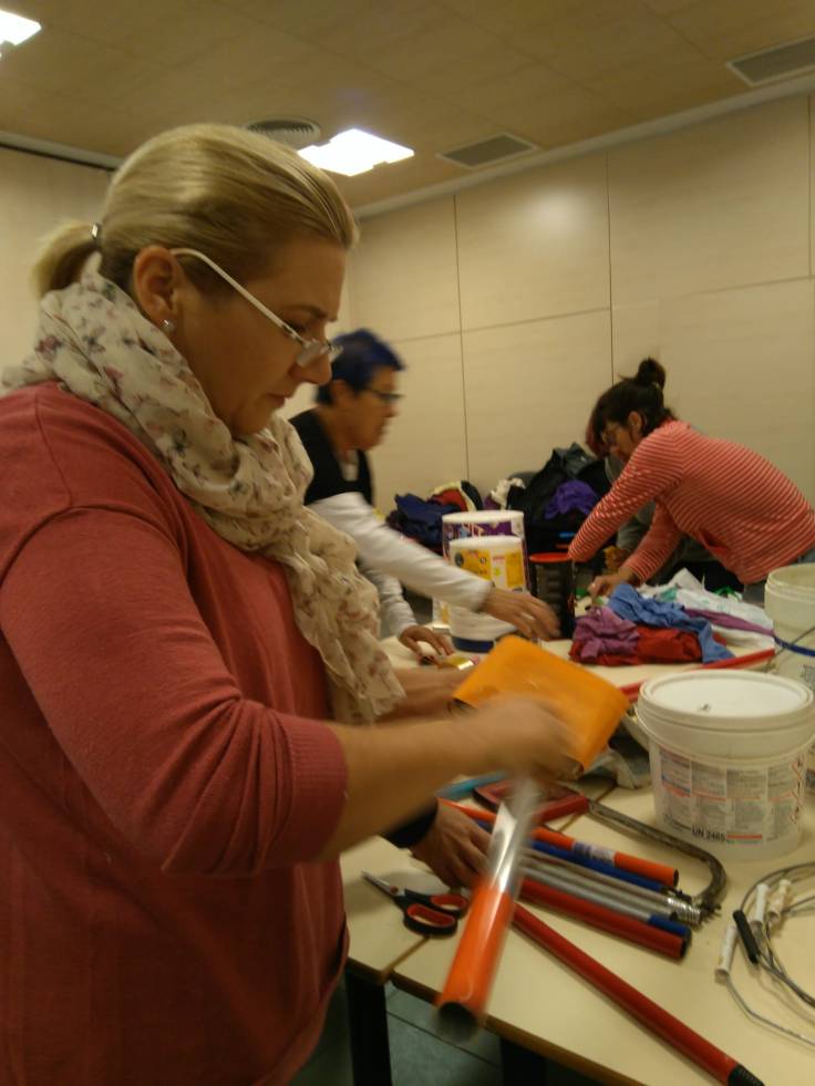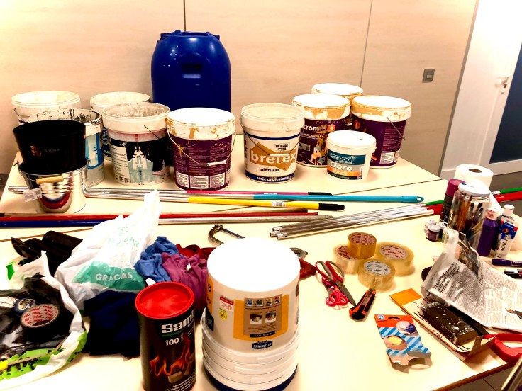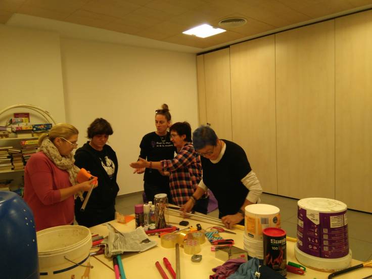 Algunas aportaron garrafas grandes, otras latas, otras recorrieron obras en busca de cubos de pintura vacíos, otras se subieron siete pisos (dos veces) para recoger más cubos y así fueron apareciendo en la sede un montón de cu- bos de plástico que había que limpiar, pintar, agujerear, decorar y acondicionar para que pasaran a ser los tambores que necesitábamos. A su vez, con unos palos de escoba, camisetas viejas, precinto de embalar y un poco (o mucha) paciencia de Isa nos fabricamos las mazas. Ella es la que se vio el tuto- rial y nos iba diciendo cómo.