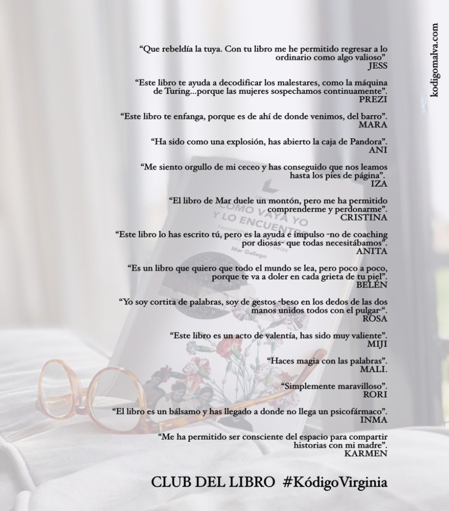 Para nosotras ha sido toda una experiencia. En primer lugar porque además de tener la suerte y el privilegio de tener a Mar en nuestras vidas, estos momentos de confinamiento no nos ha impedido intentar seguir -dentro de la normalidad posible- con nuestras actividades. Que a este libro le hayamos dedicado una sesión de nuestro club se nos ha quedado corto, porque tenemos mucho que repensarnos, reflexionar y que digerirnos. Por eso surgieron propuestas de que esta obra maravillosa se desmigase en los #LunesDeDebate. Y, por otro lado, es la primera vez que tenemos que animarnos a hablar y lo hemos hecho “ordenadamente”. En los silencios también se dice mucho (como dice la autora). Es un dolor que regenera, de toma de conciencia, como el llanto. Es emocionante, pero no triste.