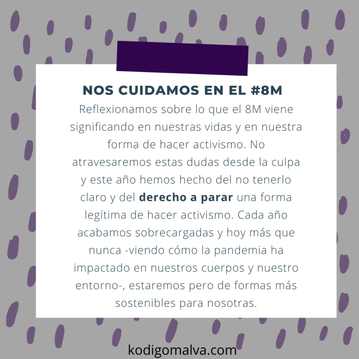 Desde Kodigo Malva llevamos repensando todo un año de pandemia las entrañas de nuestro propio activismo feminista. Siendo como somos, un grupo heterogéneo e intergeneracional, nuestras propias vidas se han visto atravesadas por diferentes situaciones que hemos vivenciado y contado en nuestras asambleas.