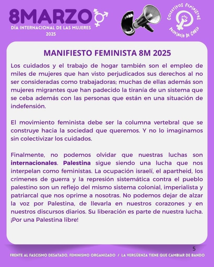 Finalmente, no podemos olvidar que nuestras luchas son internacionales. Palestina sigue siendo una lucha que nos interpelan como feministas. La ocupación israelí, el apartheid, los crímenes de guerra y la represión sistemática contra el pueblo palestino son un reflejo del mismo sistema colonial, imperialista y patriarcal que nos oprime a nosotras. No podemos dejar de alzar la voz por Palestina, de llevarla en nuestros corazones y en nuestros discursos diarios. Su liberación es parte de nuestra lucha. ¡Por una Palestina libre!