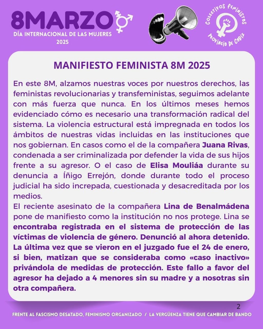 El reciente asesinato de la compañera Lina de Benalmádenapone de manifiesto como la institución no nos protege. Lina se encontraba registrada en el sistema de protección de las víctimas de violencia de género. Denunció al ahora detenido. La última vez que se vieron en el juzgado fue el 24 de enero, si bien, matizan que se consideraba como «caso inactivo» privándola de medidas de protección. Este fallo a favor del agresor ha dejado a 4 menores sin su madre y a nosotras sin otra compañera.