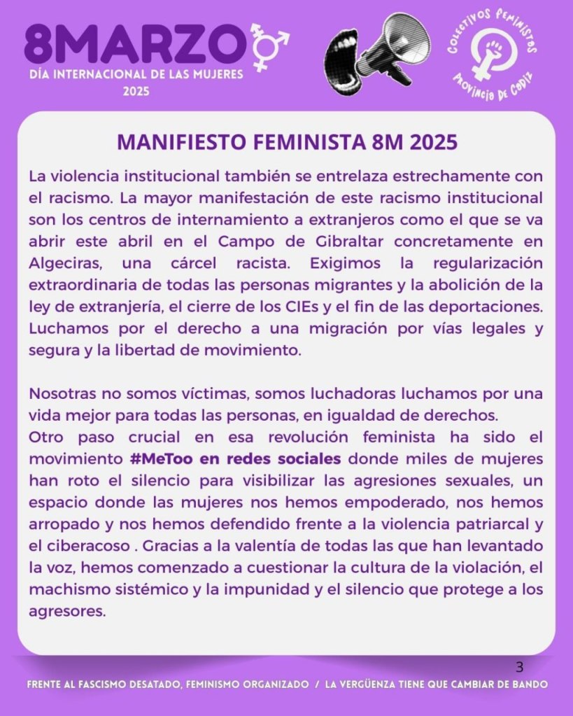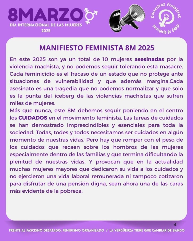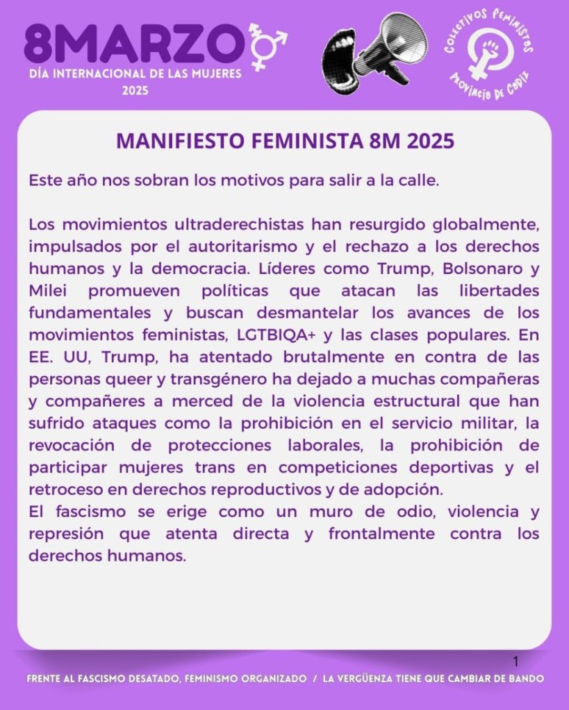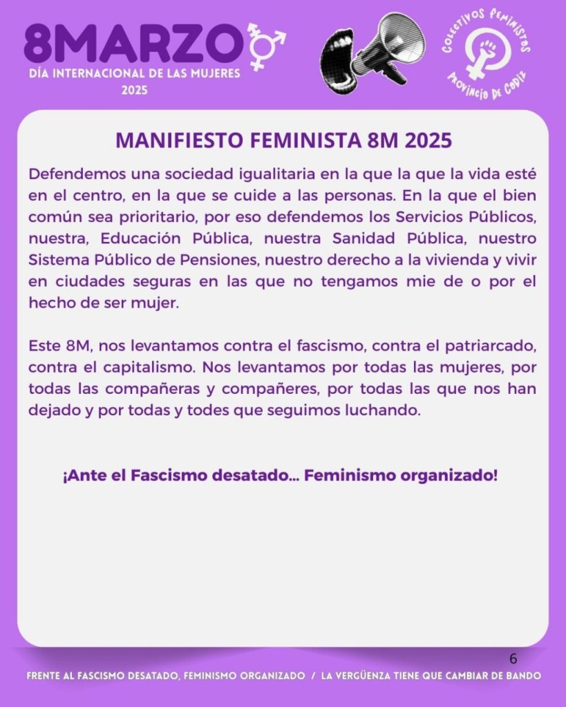 Compartimos el manifiesto de la Coordinadora de Colectivos feministas de Cádiz para este 8 de Marzo: