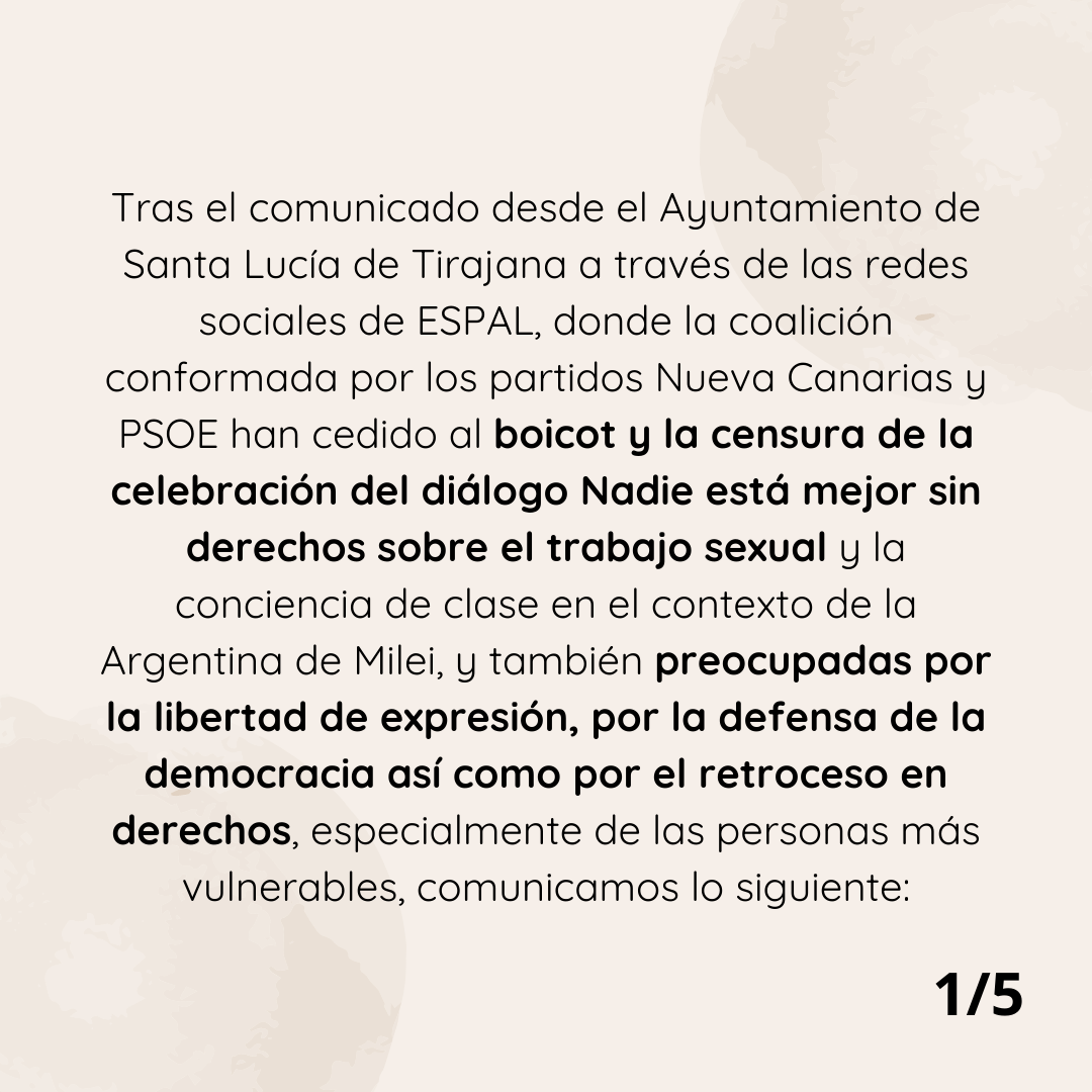 Tras el comunicado desde el Ayuntamiento de Santa Lucía de Tirajana a través de las redes sociales de ESPAL, donde la coalición conformada por los partidos Nueva Canarias y PSOE han cedido al boicot y la censura de la celebración del diálogo Nadie está mejor sin derechos sobre el trabajo sexual y la conciencia de clase en el contexto de la Argentina de Milei, y también preocupadas por la libertad de expresión, por la defensa de la democracia así como por el retroceso en derechos, especialmente de las personas más vulnerables, comunicamos lo siguiente: