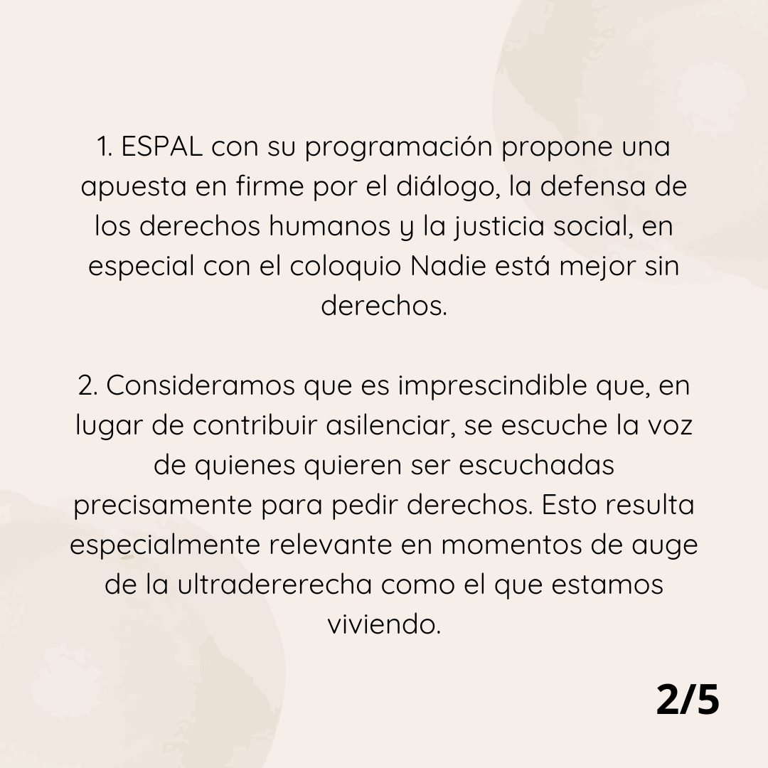 1. ESPAL con su programación propone una apuesta en firme por el diálogo, la defensa de los derechos humanos y la justicia social, en especial con el coloquio Nadie está mejor sin derechos.