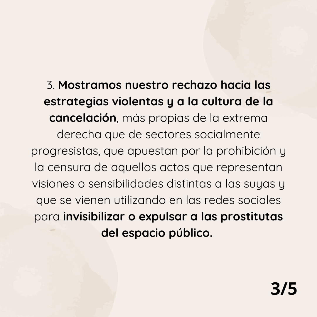 3. Mostramos nuestro rechazo hacia las estrategias violentas y a la cultura de la cancelaciòn, más propias de la extrema derecha que de sectores socialmente progresistas, que apuestan por la prohibición y la censura de aquellos actos que representan visiones o sensibilidades distintas a las suyas y que se vienen utilizando en las redes sociales para invisibilizar o expulsar a las prostitutas del espacio público.