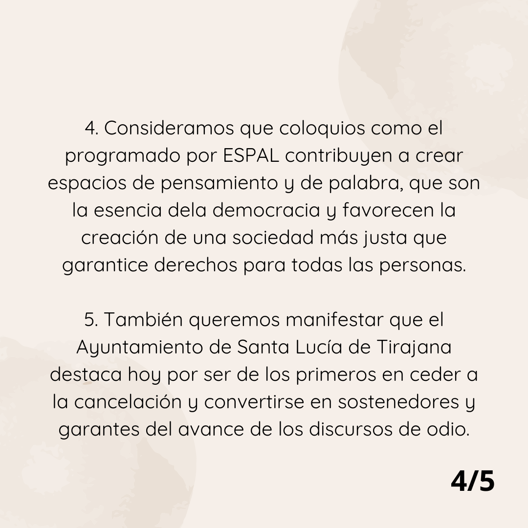 5. También queremos manifestar que el Ayuntamiento de Santa Lucía de TIrajana destaca hoy por ser de los primeros en ceder a la cancelación y convertirse en sostenedores y garantes del avance de los discursos de odio.
