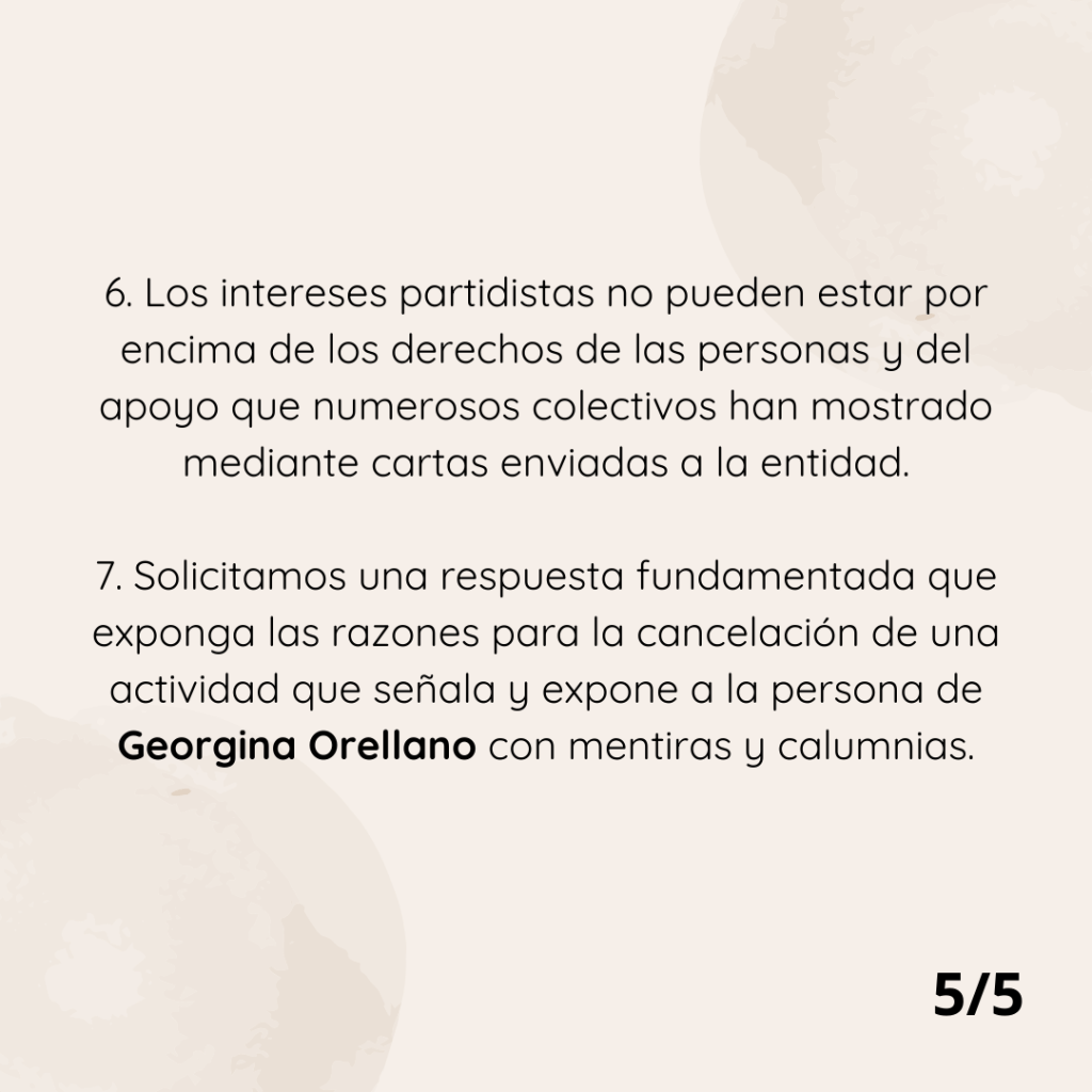 7. Solicitamos una respuesta fundamentada que exponga las razones para la cancelación de una actividad que señala y expone a la persona de Georgina Orellano con mentiras y calumnias.