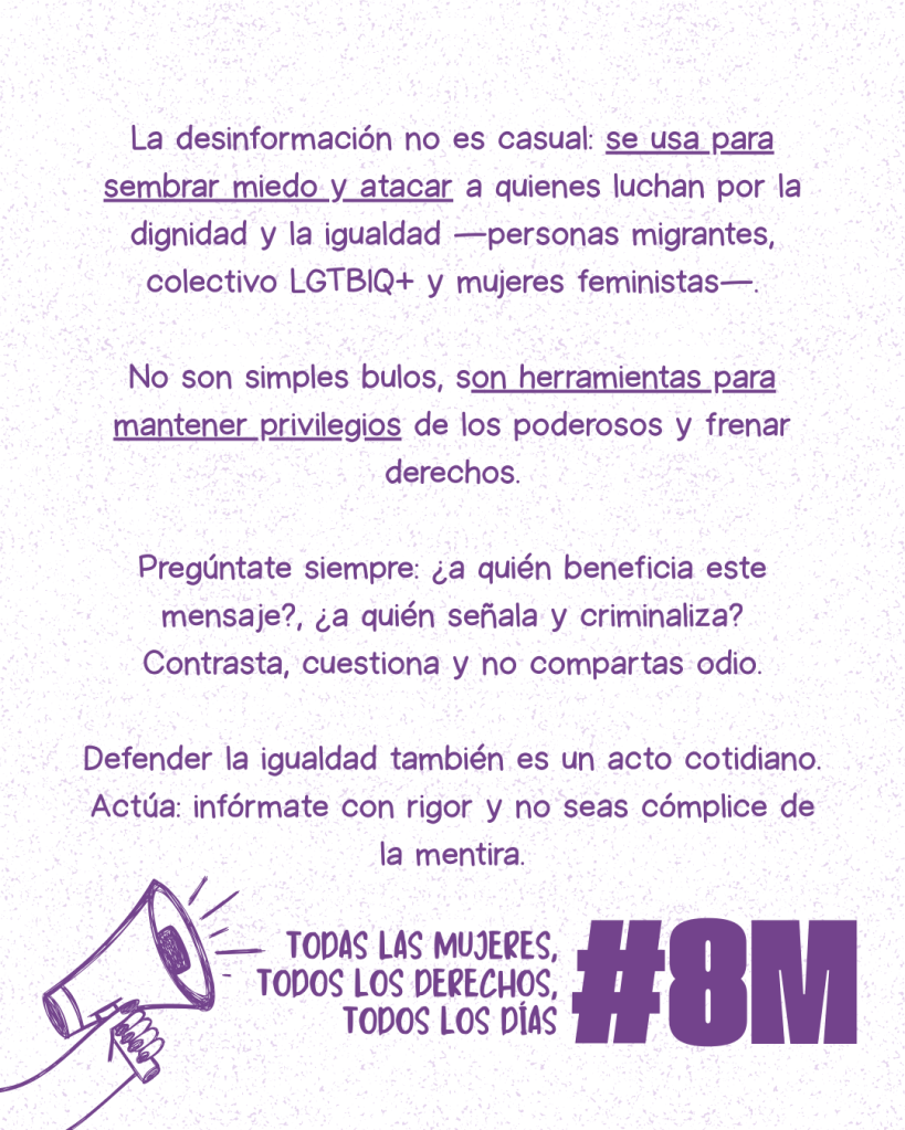 Desde una mirada feminista sabemos que estas narrativas no surgen por azar. Son reacciones ante avances en derechos y libertades. Cuando las mujeres exigen igualdad, cuando las personas migrantes reclaman dignidad, cuando el colectivo LGTBIQ+ defiende su derecho a existir sin violencia, el sistema responde muchas veces con campañas de miedo y desinformación.