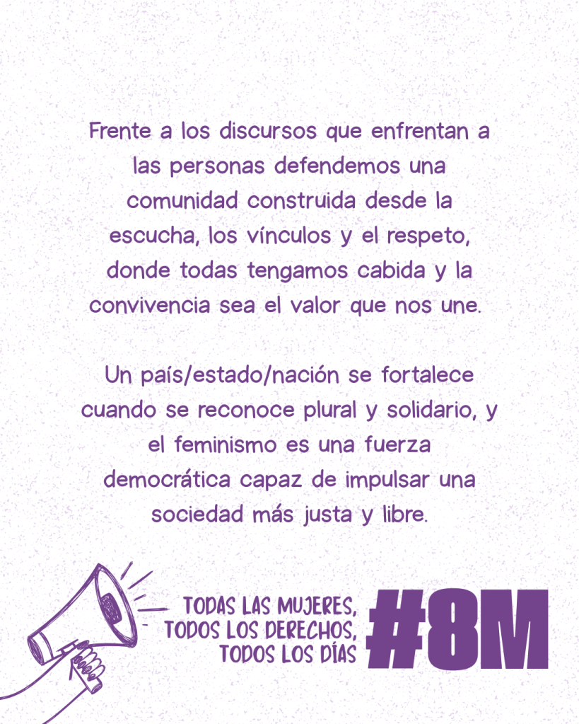 Defendemos una sociedad donde la igualdad, los cuidados y la justicia social no sean consignas, sino prácticas cotidianas sostenidas por políticas públicas y por una ciudadanía activa e informada.