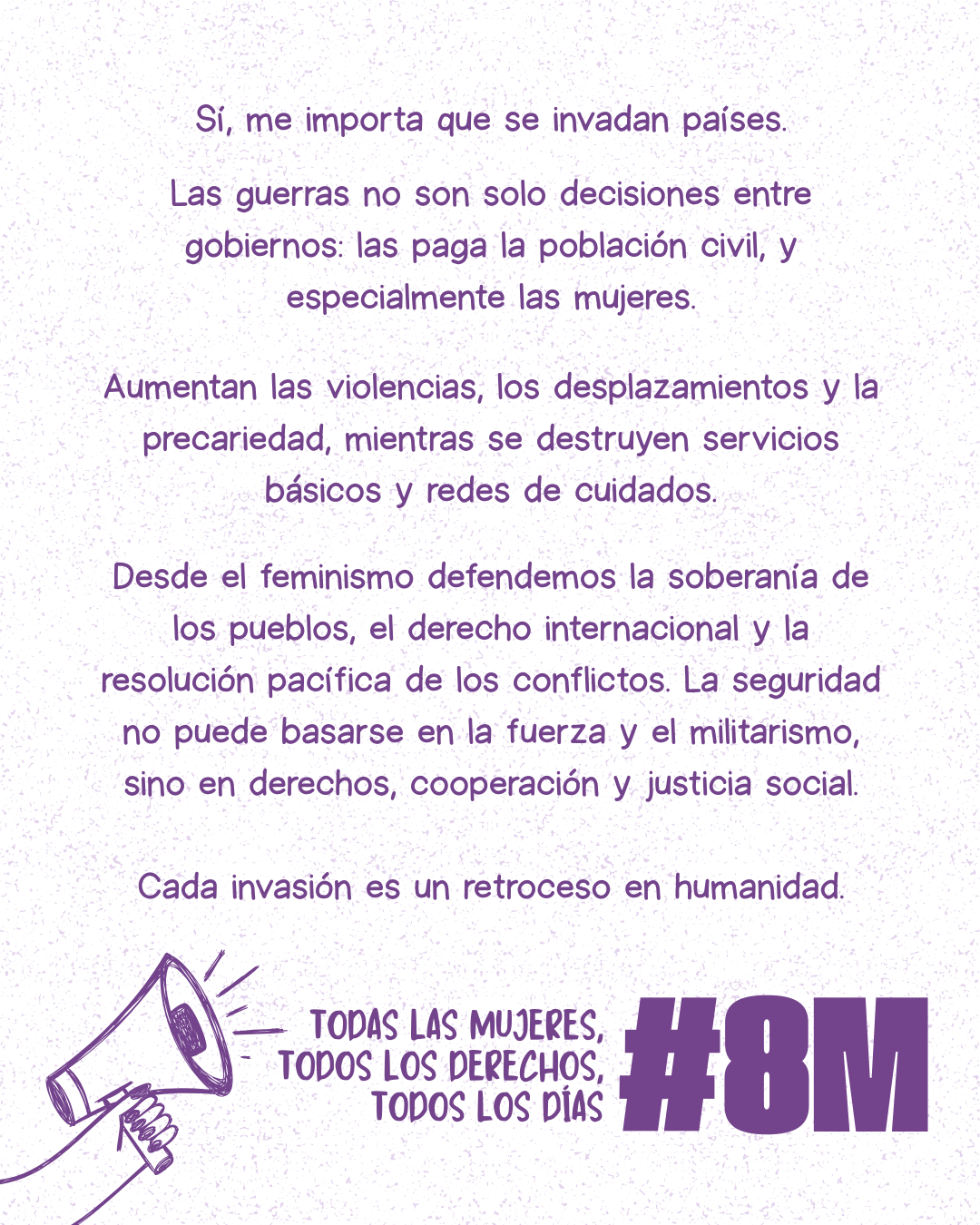 Defender la paz no es ingenuidad, es compromiso con el derecho internacional, con la soberanía de los pueblos y con la resolución diplomática de los conflictos. Las invasiones refuerzan lógicas imperialistas, militaristas y patriarcales donde la fuerza se impone sobre la vida. Y ese modelo de poder es el mismo que históricamente ha subordinado a las mujeres y a las mayorías sociales.