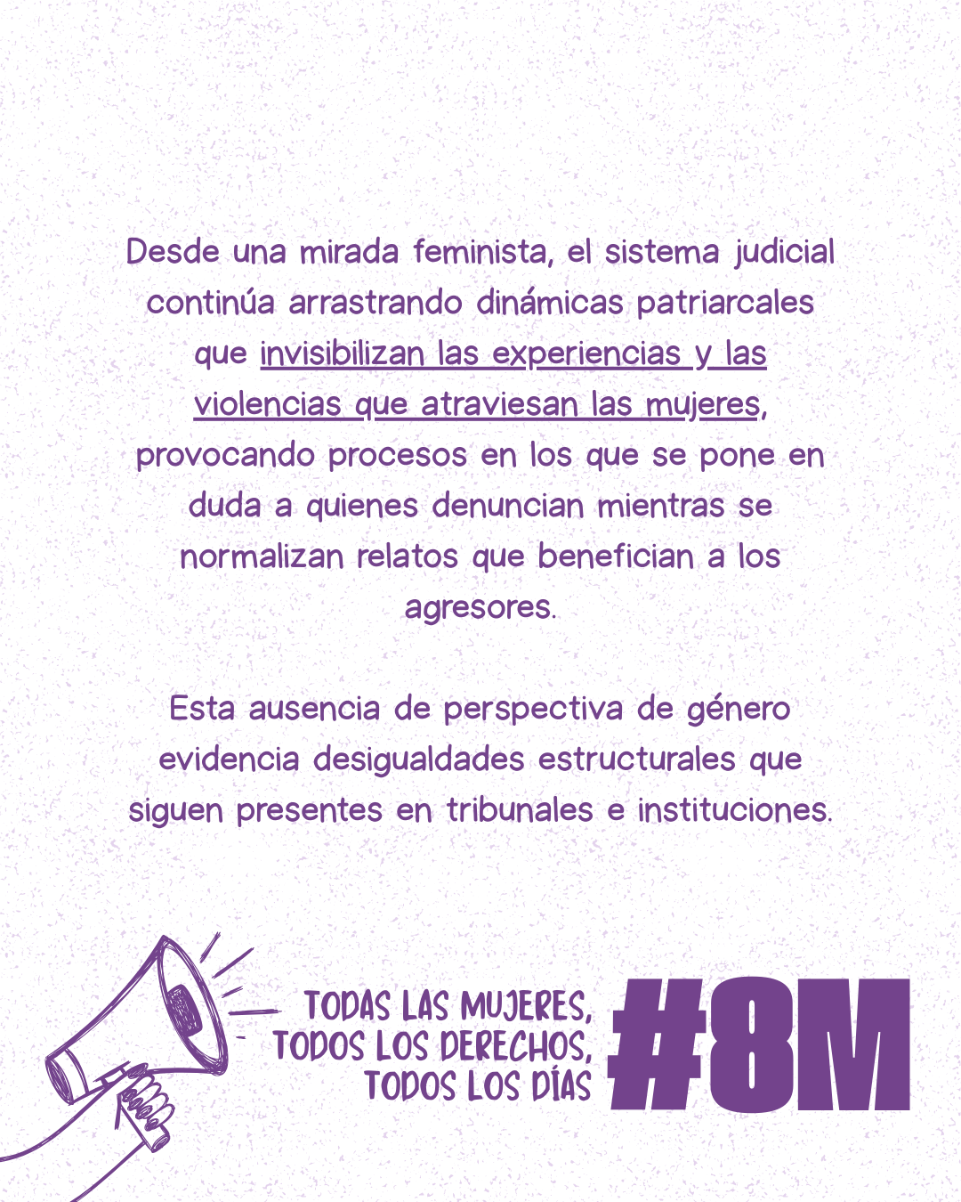 Por eso, desde una mirada activista, señalamos la urgencia de transformar la justicia desde dentro: formación feminista obligatoria, revisión de prácticas que revictimizan y mecanismos reales de protección y reparación.