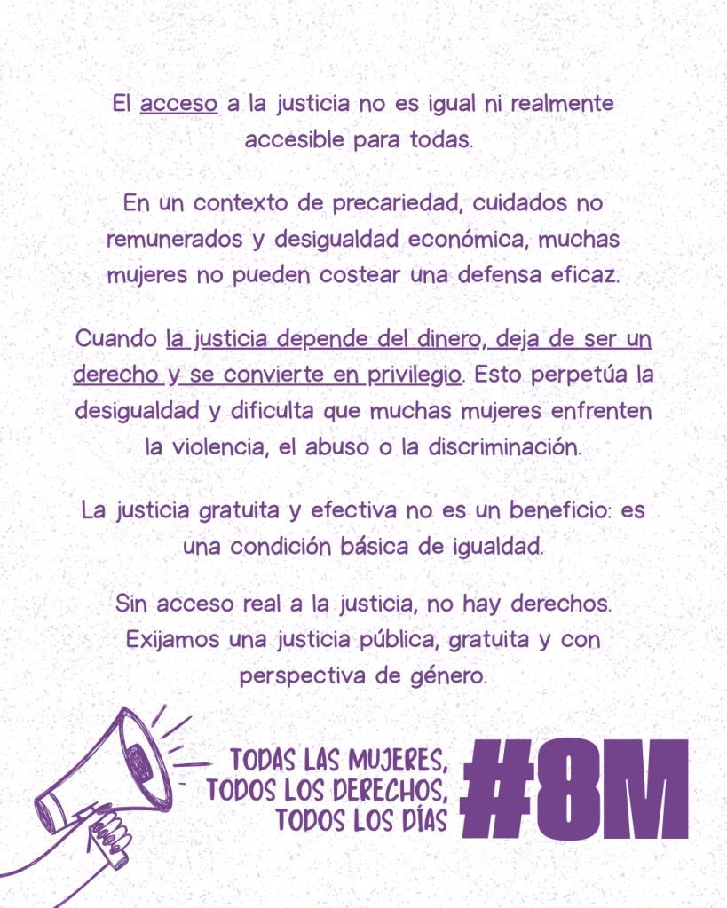 Desde una perspectiva feminista, que la justicia no sea gratuita no es un simple problema administrativo: es una forma estructural de desigualdad que afecta de manera desproporcionada a las mujeres y a otras identidades históricamente subordinadas. La gratuidad de una justicia eficaz y responsable no es un beneficio, sino una condición imprescindible para que exista igualdad real.