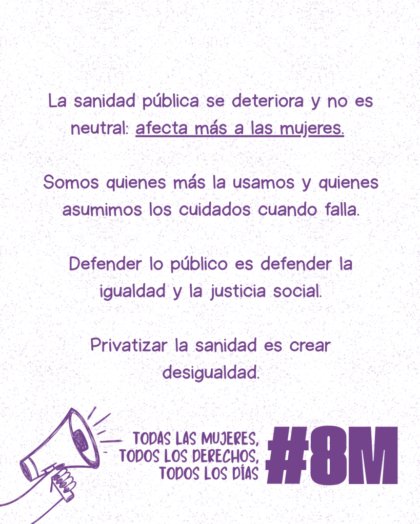 Desde el feminismo, la defensa de una sanidad pública, universal, accesible y de calidad se vincula directamente con la justicia social y la igualdad de género. No se trata solo de eficiencia económica, sino de derechos, redistribución del cuidado y garantía de acceso equitativo.