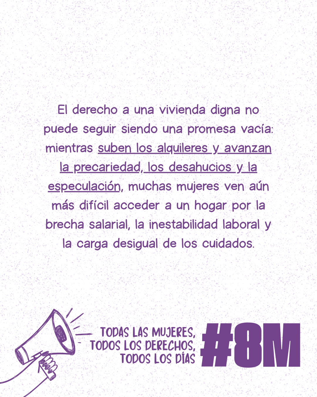 A esto se suma una realidad preocupante: los desahucios y las subidas abusivas del alquiler afectan cada vez a más familias. La precarización, la presión de grandes propietarios y fondos de inversión, y el aumento constante de precios están expulsando a muchas personas de sus barrios y dificultando construir un futuro estable.